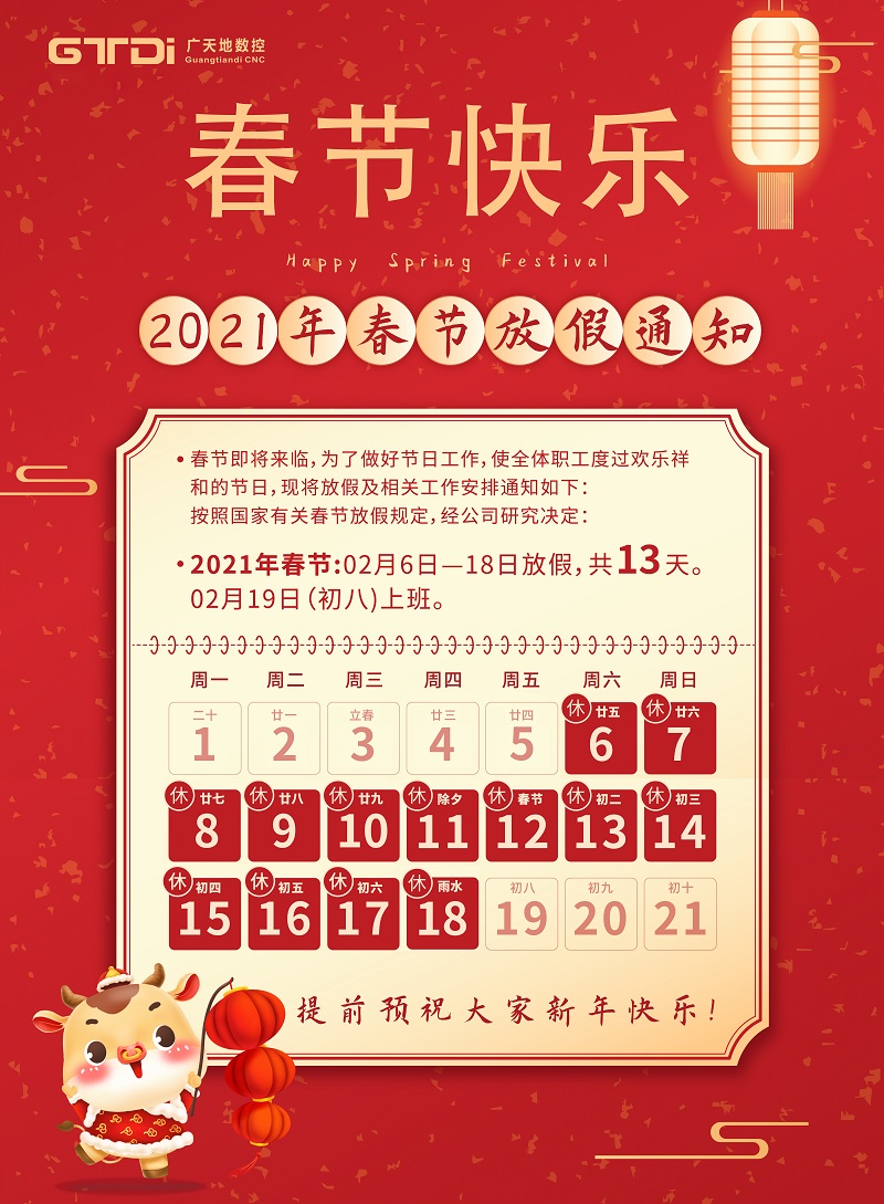 2021年春节将至,首先感谢您在2020年里的鼎力支持和愉快合作,广天地数控全体同仁在此给您拜个早年。在新年的一年里,wm365体育将更加努力,为您提供更优质的服务。按照国家春节放假规定结合我司的具体情况,春节放假时间安排如下: