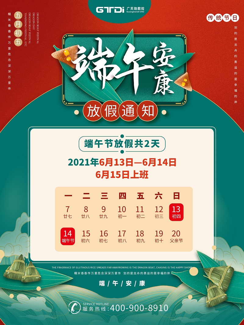根据国务院办公厅《关于2021年部分节假日安排的通知》,并结合我司实际情况,广天地数控2021年端午节放假安排如下: